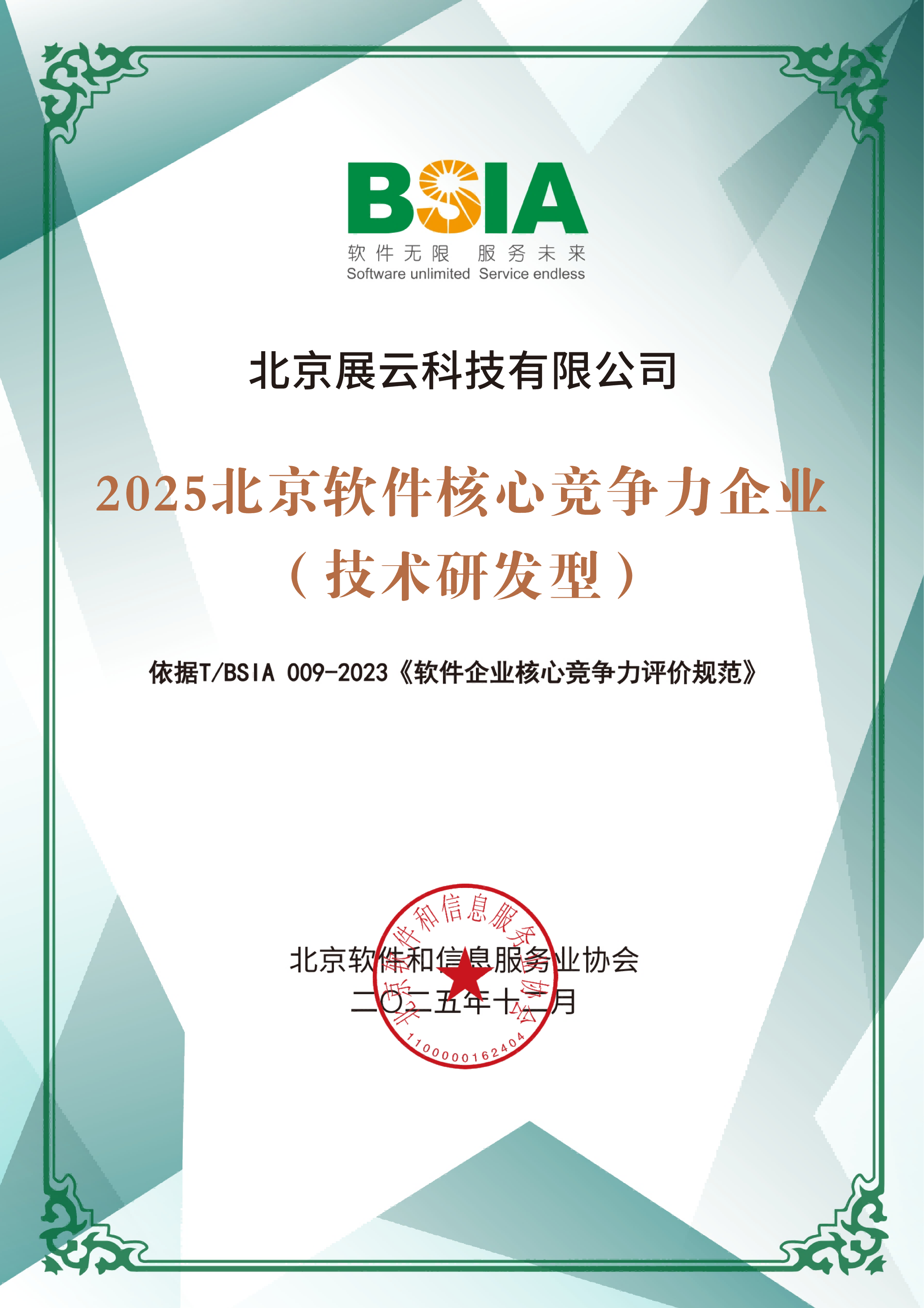 近日,北京软件和信息服务业协会公布了《2025 北京软件企业核心竞争力评价报告》,北京展云科技有限公司凭借在软件技术研发领域的卓越表现,成功荣获 “2025 北京软件核心竞争力企业(技术研发型)” 称号。